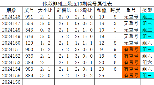 体彩排列三最近10期分别开出奖号:991、558、343、676、129、900、936、389、983、889,各奖号属性详见下表: