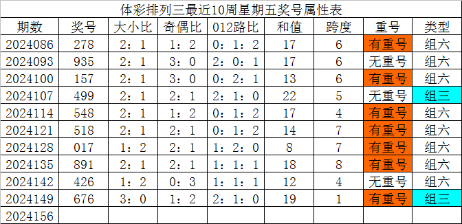 体彩排列三最近10周星期五奖号分别为:278、935、157、499、548、518、017、891、426、676,各奖号属性详见下表: