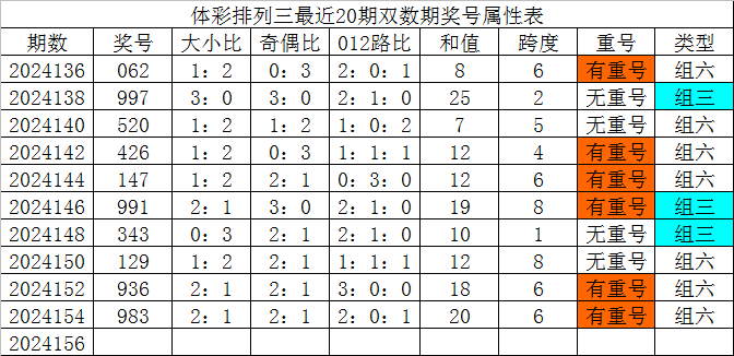 体彩排列三最近20期双数期奖号分别为:062、997、520、426、147、991、343、129、936、983,各期奖号详细属性下表:
