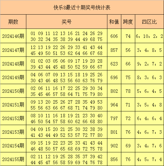 快乐8第2024155期奖号开出:02 11 12 19 25 28 35 37 39 42 44 45 47 56 58 59 69 74 76 78,其中奖号和值为856,跨度为76,四区比为4:5:7:4。
