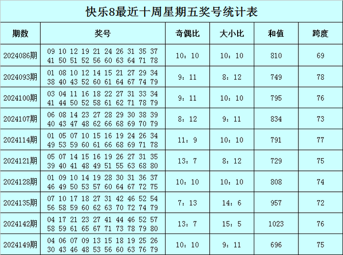 福彩快乐8第2024149期(上周五)开奖回顾:04 06 07 09 13 15 18 19 25 26 30 43 46 48 53 56 60 63 76 79,其中奖号和值为696,跨度为75,奇偶比为10:10,大小比为9:11。