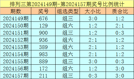 上期回顾:排列三第2024157奖号开出211,奖号质合比为3:0,大小比为0:3,跨度为1,类型为组三。