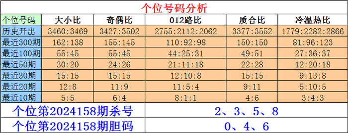 近期个位合数号码出现频率较低,目前走冷2期,本期适当关注合数回补;近期该位大号走势较冷,目前轮空2期,本期重点关注大号解冻。个位杀号:2358,胆码关注:046。