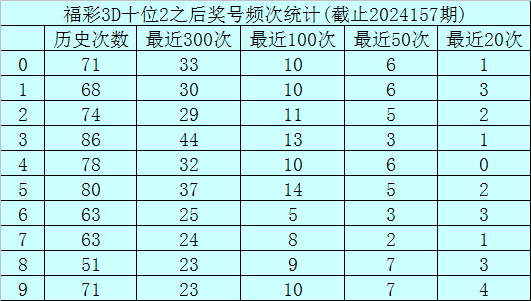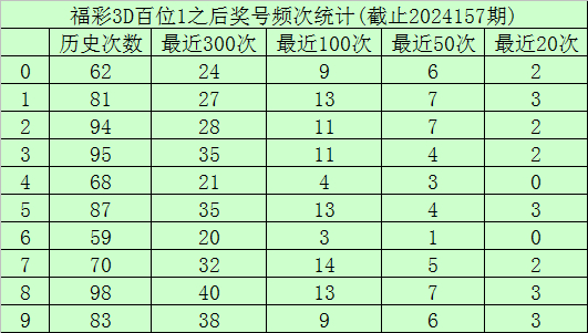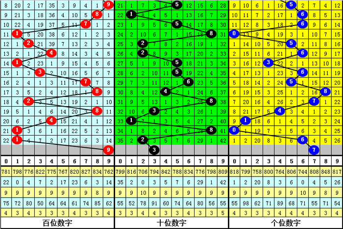 百位杀号:上期百位开出号码1,历史上百位号码1已开出798次了,最近100次百位号码1出现之后,其下期各号码频次分别为:号码7出现14次,1、5、8出现13次,2、3出现11次,0、9出现9次,4出现4次,6出现3次。