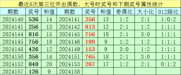 前7次第三位号码开出偶数、大号时奖号分别为:536、256、816、756、426、356、848,其中奇偶总比例为8:13,有2期奇偶比与上期奇偶比相同;号码大小总比例为14:7,有1期奖号大小比与上期大小比相同;