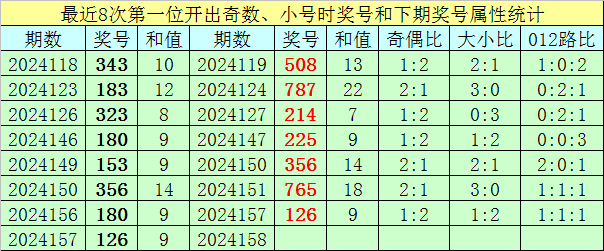 前7次第一位号码开出奇数、小号时奖号分别为:343、183、323、180、153、356、180,其中奇偶总比例为13:8,有2期奇偶比与上期奇偶比相同;号码大小总比例为6:15,有4期奖号大小比与上期大小比相同;