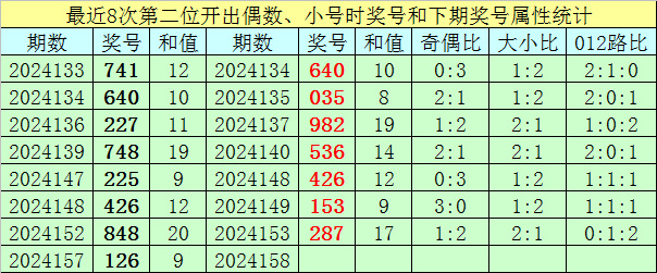 前7次第二位号码开出偶数、小号时奖号分别为:741、640、227、748、225、426、848,其中奇偶总比例为5:16,有3期奇偶比与上期奇偶比相同;号码大小总比例为9:12,有5期奖号大小比与上期大小比相同;