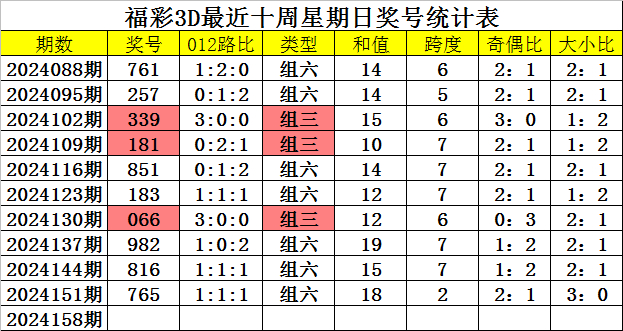 奖号类型分析:从近期周日开奖数据分析,组六近期热出,十周内出现7次,上周日为组六号码,组三出现3次,表现相对较冷,本周日预计继续开出组六号码。