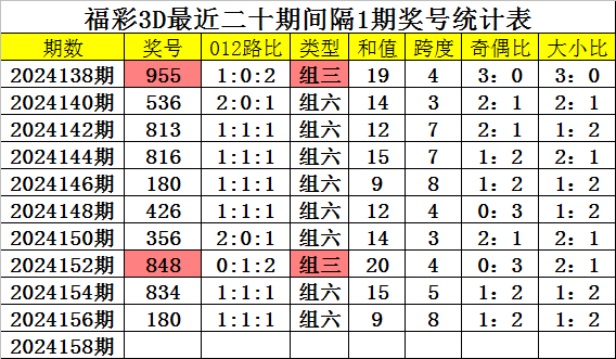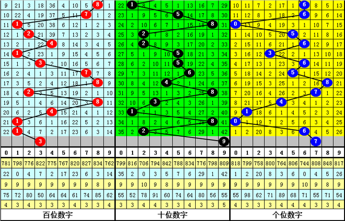 跨度分析:最近周日跨度出现范围在2-7区间,跨度比较集中,上周日跨度为2,跨度下降5个点位,本期看好跨度上升,参考跨度6。