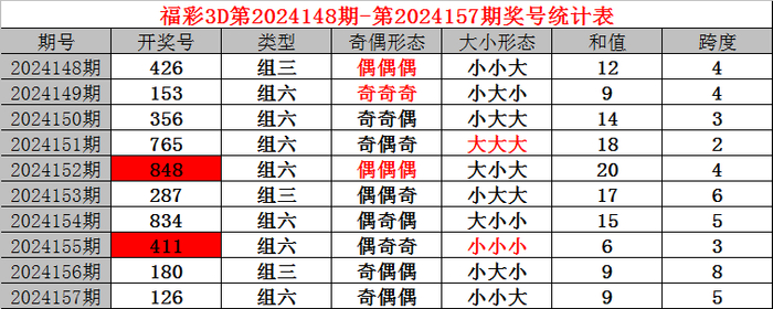上期回顾:福利彩票3D第2024157期开奖结果126。奖号:奇偶偶、小小大,和值9,跨度5。