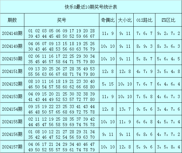 福彩快乐8第2024157期开出奖号:04 06 17 21 24 29 34 40 46 47 49 50 52 55 57 59 61 74 78 79,其中奖号奇偶比为10:10,大小比为12:8,012路比为5:9:6,四区比为3:5:8:4。