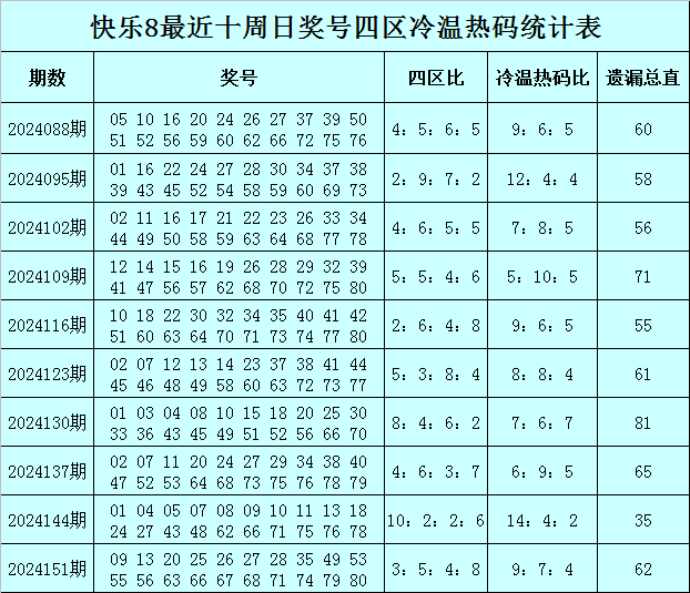 福彩快乐8第2024151期(上周日)开奖回顾:09 13 20 25 26 27 28 35 49 53 55 56 63 66 67 68 71 74 79 80,其中奖号四区比为3:5:4:8,冷温热码比为4:7:9。