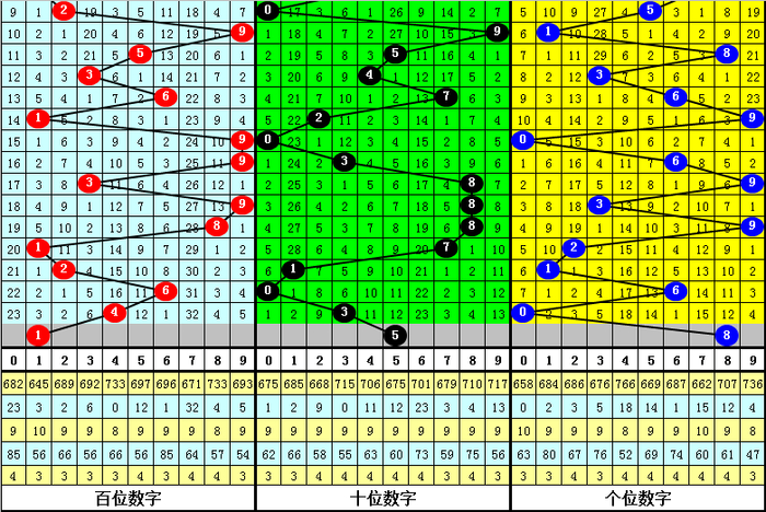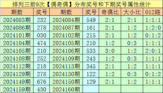在最近9期开出奇偶分布:偶奇偶的奖号为:232-278-030-474-210-252-218-278-676,在下期出现号码分别为:549-161-215-210-533-243-345-122-129。其中百十个位号码分布情况如下: