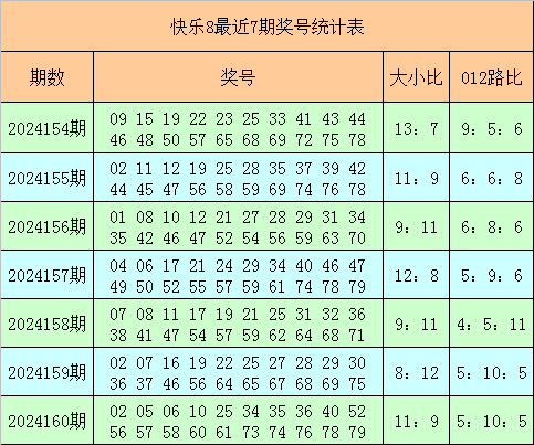 快乐8第2024160期奖号为:02 05 06 10 25 34 35 36 40 52 56 57 58 60 61 73 74 76 78 79,其中奖号012路比为5:10:5,大小比为11:9。