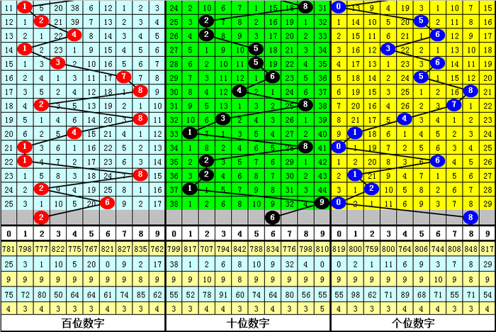 十位分析:前50期出号频次较高的号码为:4、5、8开出8次;出号频次较低的号码为:7、9开出2次,0开出3次。该位号码大小比为24:26,012路比为13:15:22。本期该位排除两码4、8,注意号码0、5、6,精选一码6。
