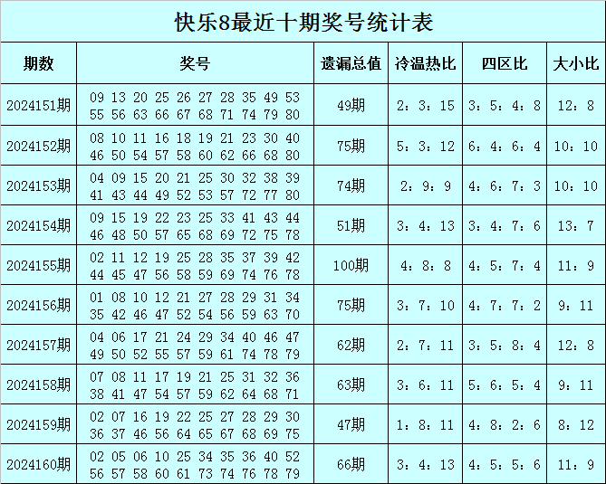 福彩快乐8第2024160期开奖回顾:02 05 06 10 25 34 35 36 40 52 56 57 58 60 61 73 74 76 78 79,其中奖号遗漏总值为66,冷温热码比为3:4:13,四区比为4:5:5:6。
