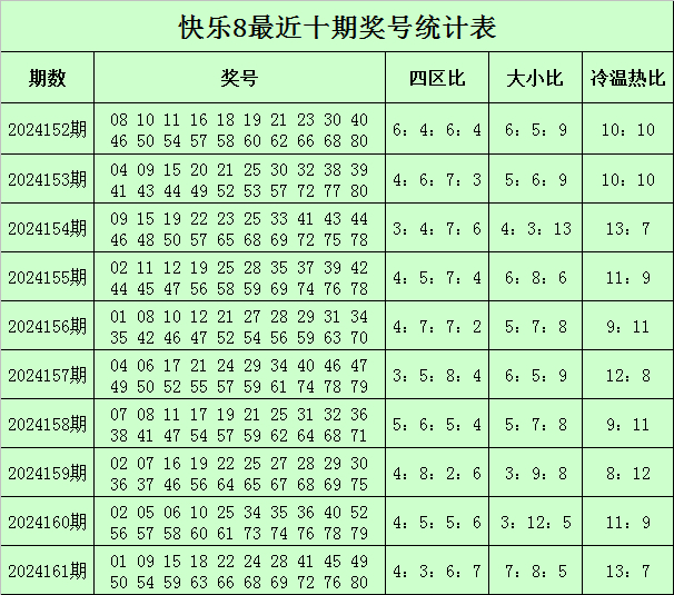 福彩快乐8第2024161期开奖回顾:01 09 15 18 22 24 28 41 45 49 50 54 59 63 66 68 69 72 76 80,其中奖号四区比为4:3:6:7,冷温热码比为7:8:5,大小比为13:7,和值为909,同尾号码为50 80、01 41、22 72、24 54、15 45、66 76、18 28 68、09 49 59 69。