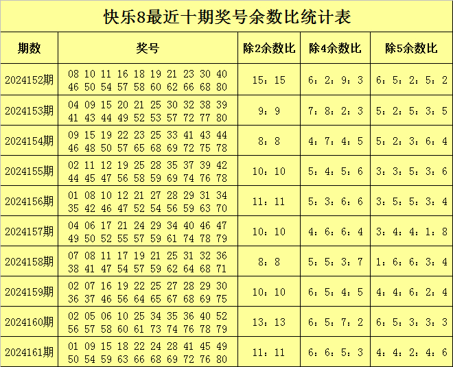 福彩快乐8第2024161期开奖回顾:01 09 15 18 22 24 28 41 45 49 50 54 59 63 66 68 69 72 76 80,其中奖号二区比为13:7,四区比为4:3:6:7,五区比为3:4:2:5:6,除2余数比为9:11,除4余数比为6:6:5:3,除5余数比为4:4:2:4:6。