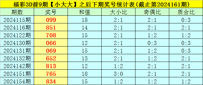 二、福彩3D上期开出奖号468,奖号大小比为2:1,大小类型开出【小大大】,该类型组合奖号在前9次分别开出号码:075-099-289-067-066-069-256-356-287;