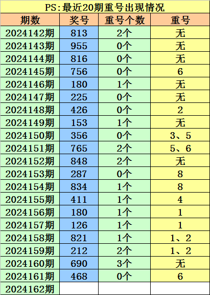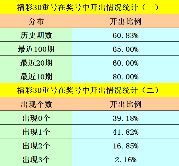 最近100期开奖中,含有重号的奖号有65期,最近20期含有重号的奖号有12期,最近10期含有重号的奖号有8期。本期排除重号。