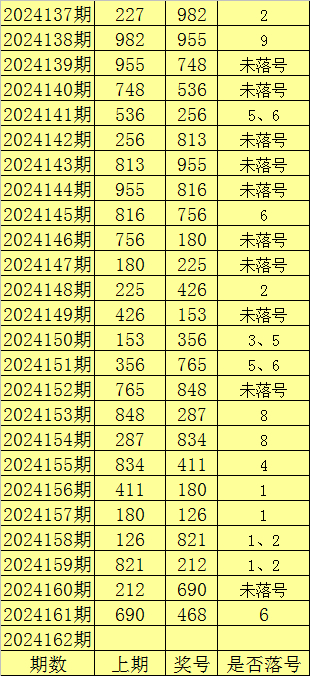 福彩3D第2024161奖号468,重号落号。在最近100期(第2024062期-2024161期)中,重号落号65期;最近20期重号落号概率为60%;最近10期重号落号概率为80%。本期防重号中号码轮空。