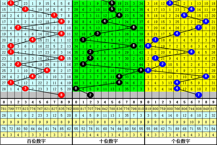 百位上期出现:温号3,该位连续十期以热号出现较多,以冷号出现较少,目前百位热号有6个:1、2、3、4、6、8,本期看好开出热号再次出现,参考号码8。