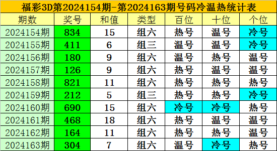 上期回顾:福彩3D第2024163期开奖奖号为:304,奖号类型为:组六,奖号冷温热态为:温号+冷号+热号。
