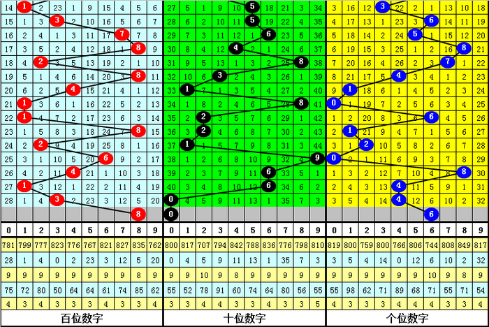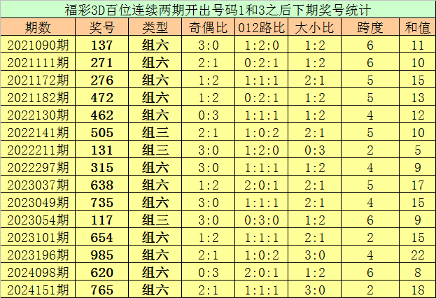 百位号码:连续两期百位出号分别为:1-3,历史上福彩3D连续两期前后分别出号1-3的奖号共出现96次。在百位1-3的奖号现象出现时,近15期下期分别出号:137-271-276-472-462-505-131-315-638-735-117-654-985-620-765;