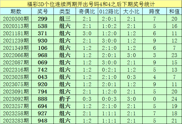 个位号码:最近两期个位开出号码为4-4,在福彩3D历史开奖中,前后两期个位分别开出号码4-4的奖号出现了78次。最近15期个位4-4组合出现之后,其下期奖号分别为:299-538-371-930-106-968-069-742-043-920-794-888-694-927-948;