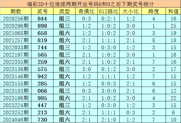 十位号码:前两期十位分别出现奖号6-0,历史上福彩3D连续前后分别开出号码6-0的现象共开出83次。在十位6-0的现象出现时,最近15期其下期分别开出号码:844-898-658-819-744-565-259-575-942-285-066-985-447-213-730;