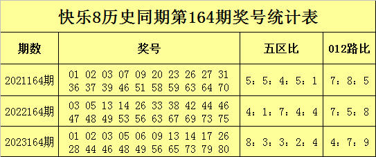 第17-20位号码分析:历史同期第164期出现范围在59-80区段,号码012路比为3:6:3,去年同期开出奖号:65+73+79+80,号码012路比为0:2:2。