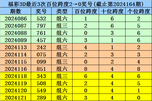 第2024118-第2024120期奖号:343、508、549,其下期奖号为:289,首位号码跨度为3;