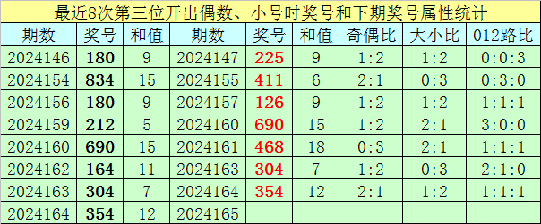 上期回顾:福彩3D第2024164期开出奖号为354,奖号奇偶比为2:1,大小比为1:2,012路比1:1:1。
