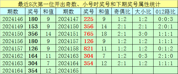 前7次第一位号码开出奇数、小 号时奖号分别为:180、153、356、180、126、164、304,其中奇偶总比例为10:11,有1期奇偶比与上期奇偶比相同;号码大小总比例为7:14,有5期奖号大小比与上期大小比相同;