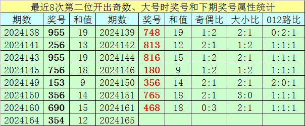 前7次第二位号码开出奇数、大号时奖号分别为:955、256、955、756、153、356、690,其中奇偶总比例为15:6,有2期奇偶比与上期奇偶比相同;号码大小总比例为16:5,有1期奖号大小比与上期大小比相同;