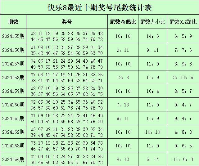 福彩快乐8第2024164期开奖回顾:02 04 10 13 24 27 30 33 34 35 36 46 50 52 53 56 61 67 70 73,其中奖号尾数012路比为11:6:3,尾数大小比为6:14,奇偶比为8:12。
