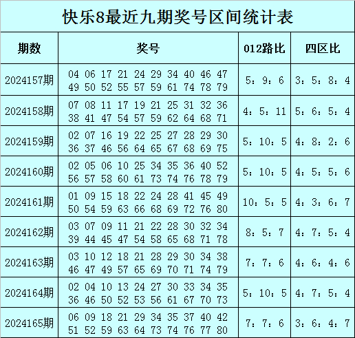 福彩快乐8第2024165期开出奖号:06 09 18 21 29 34 35 37 40 42 51 52 59 63 64 73 74 76 77 80,其中奖号012路比为7:7:6,四区比为3:6:4:4。