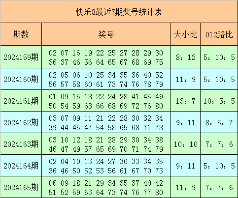 快乐8第2024165期奖号为:06 09 18 21 29 34 35 37 40 42 51 52 59 63 64 73 74 76 77 80,其中奖号012路比为7:7:6,大小比为11:9。