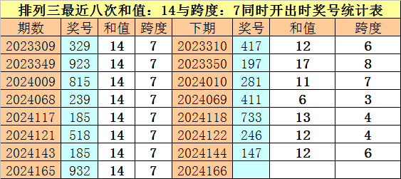 体彩排列三最近八次同时出现和值:14与跨度:7的奖号分别为:329、923、815、239、185、518、185、932,前七次下期开出奖号分别为:417、197、281、411、733、246、147,详见下表: