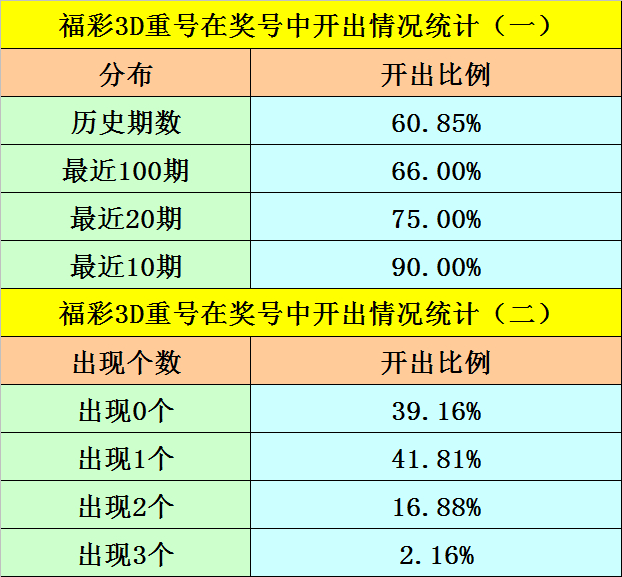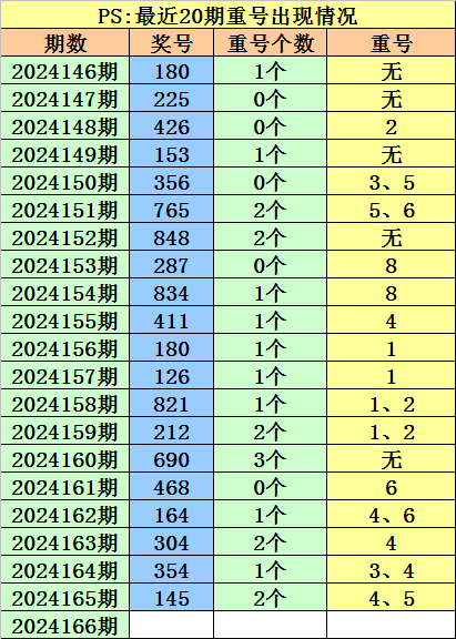 最近100期开奖中,含有重号的奖号有66期,最近20期含有重号的奖号有15期,最近10期含有重号的奖号有9期。本期注意重号落号。