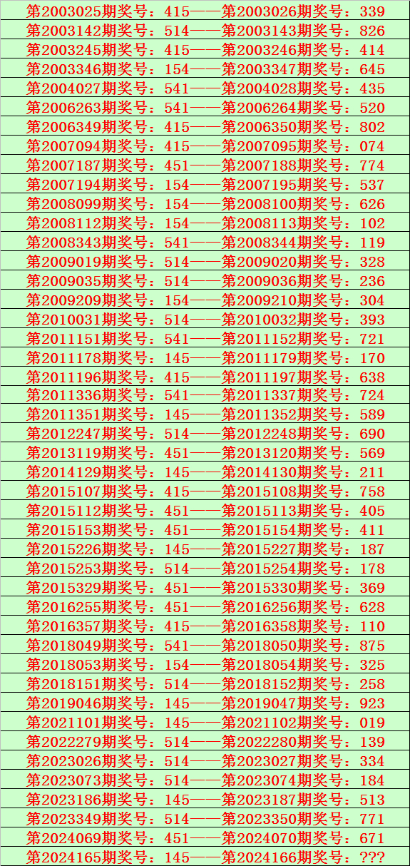 福彩3D第2024166期开奖日期:2024年6月24日,历史上第166期已开出了22次奖号,历年同期号码分别为:413、289、644、775、426、581、128、209、503、454、112、042、316、189、396、496、941、531、808、873、487、557。
