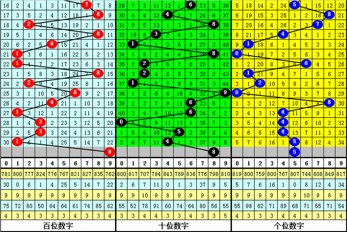 百位上期出现:热号1,该位连续十期以热号出现较多,以冷号出现较少,目前该位遗漏15期以上的冷号有3个:0、5、9,本期注意该位冷号逐渐解冻,关注冷号9。