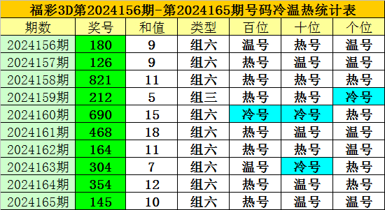 上期回顾:福彩3D第2024165期开奖奖号为:145,奖号类型为:组六,奖号冷温热态为:热号+温号+温号。