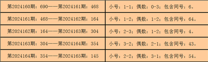 统计3D历史上已开出的奖号发现,在连续5期开奖号码中:3D在第2024160期-第2024164期分别开出奖号:690-468-164-304-354。