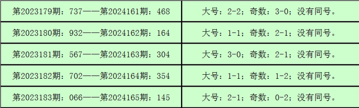 则,3D第2023184期开出奖号:730,其大小比为1:2,奇偶比为2:1,012路比为2:1:0,与3D第2024166期奖号可能没有同号。