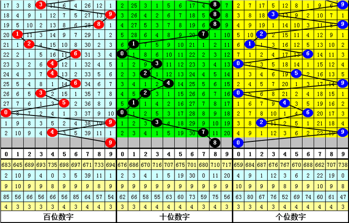 个位分析:上期开出号码9,近10期个位号码012路比为6:2:2,其中0路号码走冷1期之后出现,本期预计个位再出0路号码,一码关注0。