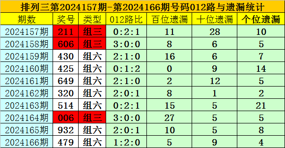 开奖回顾:排列三第2024166期奖号为:479,类型为组六,号码012路比为1:2:0,百十个位号码直选分别遗漏5期、9期和4期。