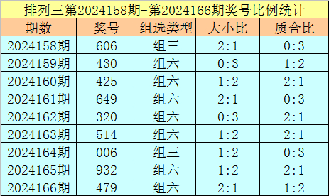 上期回顾:排列三第2024166奖号开出479,奖号质合比为1:2,大小比为2:1,跨度为5,类型为组六。