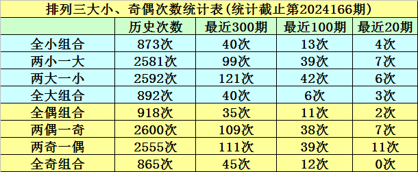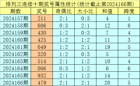 上期回顾:排列三第2024166期奖号:479。类型:组六,奇偶形态:偶奇奇,大小形态:小大大,和值:20,跨度:5。