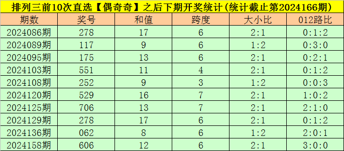 4.下期奖号和值分别为:17、9、13、11、9、16、13、17、8、12,和值奇偶比为7:3,大小比为3:7,和值012路比为3:3:4,本期注意0路和值出现,参考和值15。
